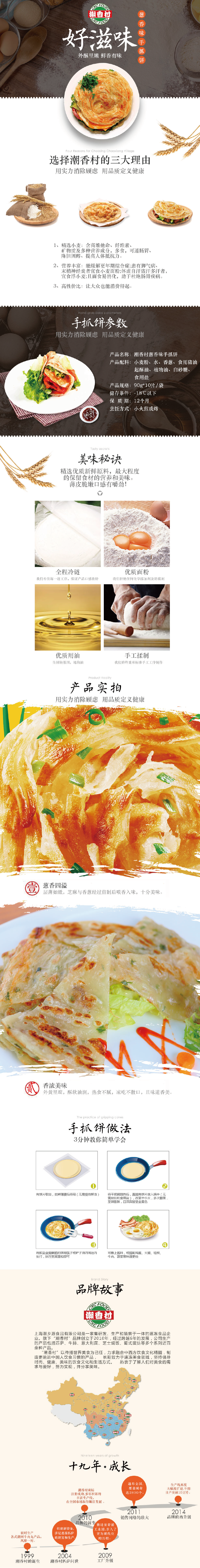 產品介紹:蔥香手抓餅——經典蔥香口味 [酥脆可口]外層金黃酥脆,內層柔軟白嫩;帶給你唇齒間不凡的美味體驗 [香味四溢]千層百疊,絲絲相扣,色澤金黃,口感韌性;外焦里嫩,芳香四溢,飽滿勁道,回味悠長! 工藝:半制成品 規格(g):900g 包裝規格:10片/袋 箱規:10盒/箱